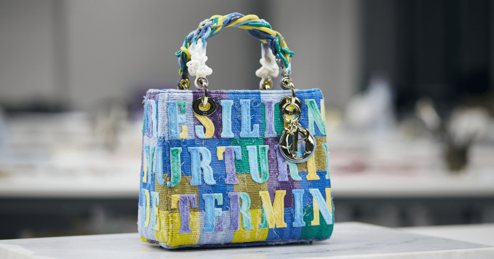 Le cuir du sac est orné d’un patchwork de broderies, de pierres précieuses et de sequins, ou d’une tapisserie tissée à la main, à travers laquelle peuvent être gravés les mots “fort”, “aimant”, “résilient” ou “déterminé”, évoquant la qualités attribuées aux femmes.