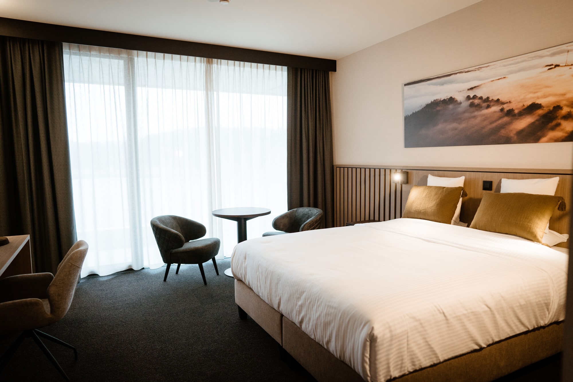L’hôtel comprend 90 chambres et suites allant de 32 à 64m2 au design moderne et confortable. De grandes baies vitrées laissant rentrer la lumière naturelle couplées à la construction en Y du bâtiment, donnent une vue imprenable sur les lacs et les 40 hectares de nature environnante. Le combo idéal pour une soirée à se prélasser dans sa chambre, tout en profitant de l’incroyable cadre naturel atour de l’hôtel (avec une vue pareille, on est tenté de faire justement ça).
