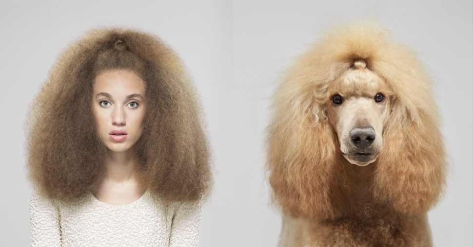 “Le plan était d’abord de photographier les chiens et de chercher des personnes qui leur ressemblaient comme deux gouttes d’eau. Puis de les coiffer pour finalement les faire poser de la même manière que leur ami à quatre pattes. Ce processus a été répété jusqu’à ce que nous ayons tous les clichés. Pendant cette période, j’ai scruté les rues pour chercher des personnes qui ressemblaient vraiment aux chiens. J’ai parlé avec la plupart des personnes que j’ai shootées dans la rue et j’ai essayé de leur dire avec tact: “Tu ressembles à un caniche, est-ce que je peux te prendre en photo ?”