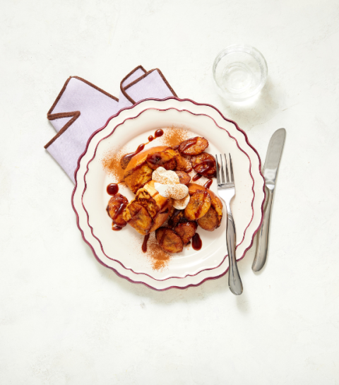 - Als alle plakken gebakken zijn: smelt nogmaals een klontje boter in een pan. Voeg 1/2 theelepel kaneel toe en laat kort geurig worden. Leg de bananen met de snijkant naar beneden in de pan en bak twee minuten. Draai om en bak twee minuten tot beide kanten goudbruin zijn.